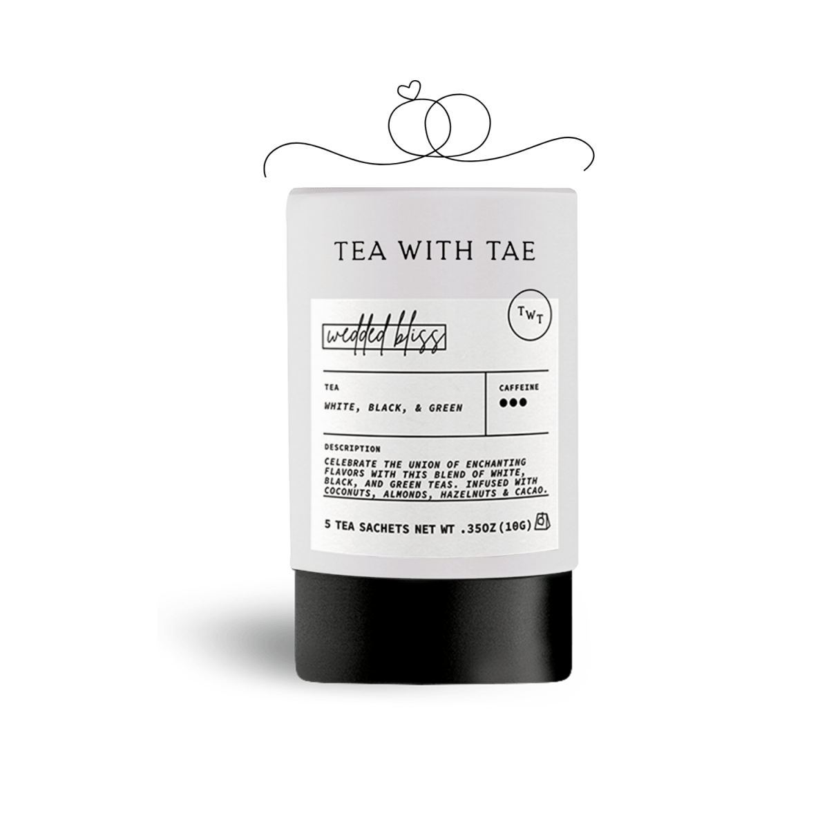 A truly exceptional and romantic blend, Wedded Bliss is a celebration of love and harmony, combining three premium whole-leaf teas: Pai Mu Tan white tea, Ceylon black tea, and Chinese green tea. This elegant fusion is enhanced with toasty almonds, coconut flakes, cinnamon chips, chocolate, and hazelnuts, creating a rich and indulgent flavor profile. Each sip is a perfect balance of nutty warmth, creamy sweetness, and delicate spice, symbolizing the beauty and unity of two becoming one. A tea as unforgettable as your special day.
